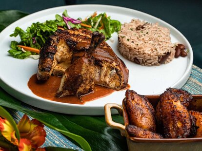 The food: "A tasting tour across the Caribbean" with Latin, French, Asian, and African influences. Starters include seafood fritters; crispy fish tacos; and gochujang wings with a sweet heat glaze. Choose from signature wood-fired flatbreads in five varieties like wild roasted mushroom along with mains like slow braised oxtail; chicken & waffles with house made syrup and coconut whipped cream; Koko's Island Pasta with island cream sauce; jerk chicken; a signature burger with guava BBQ and cilantro sauce; and seafood dishes like salmon filet or snapper. Dedicated vegan selections include jackfruit tacos; lentil meatballs in coconut curry; and a spicy portobello burger. Pair it with cocktails like the Rude Gyal (rum, coconut cream, nutmeg), a special good juice mango rum punch, or the Good Vibez (tequila, passion fruit, egg white).